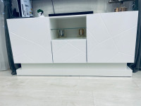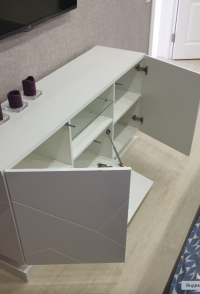 По бокам расположены две распашные дверцы, за которыми находятся вместительные отделения с полками для хранения приставок, документов, кабелей и других необходимых мелочей. В центральной части предусмотрена откидная дверца, а над ней расположена открытая ниша со стеклянной полкой. Такое решение делает тумбу не только удобной в использовании, но и визуально более легкой. На открытой полке можно разместить декор, книги или мультимедийные устройства.